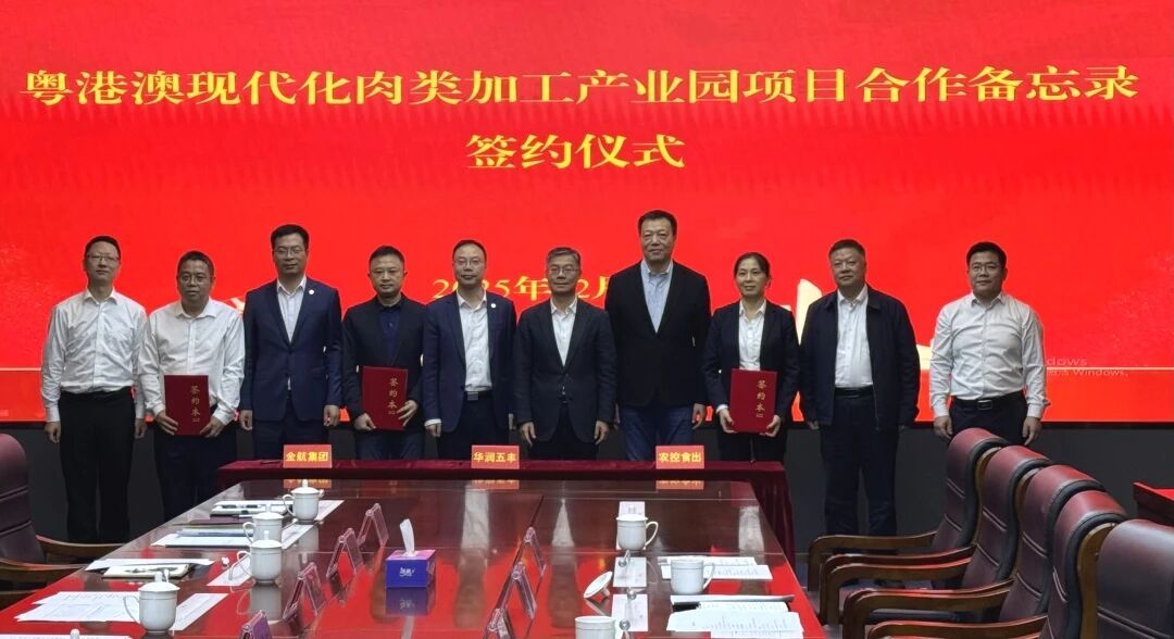 2025年12月18日下午,在线a天v堂一区99xx旗下广东省珠海粮油食品进出口有限公司(以下简称“食出公司”)与华润五丰(中国)投资有限公司(以下简称“华润五丰”)、珠海金航产业投资集团有限公司(以下简称“金航集团”)在珠海市金湾区市民服务中心共同签署《粤港澳现代化肉类加工产业园项目合作备忘录》,标志着三方将强强联合,携手打造一个深耕珠海、服务港澳、辐射珠西、面向全国的高标准现代化肉类供应新平台。金湾区委书记梁耀斌,华润五丰副总经理许宗煜,在线a天v堂一区99xx党委书记、董事长李鸿斌等出席签约仪式,金湾区政协副主席黎文星主持签约仪式。